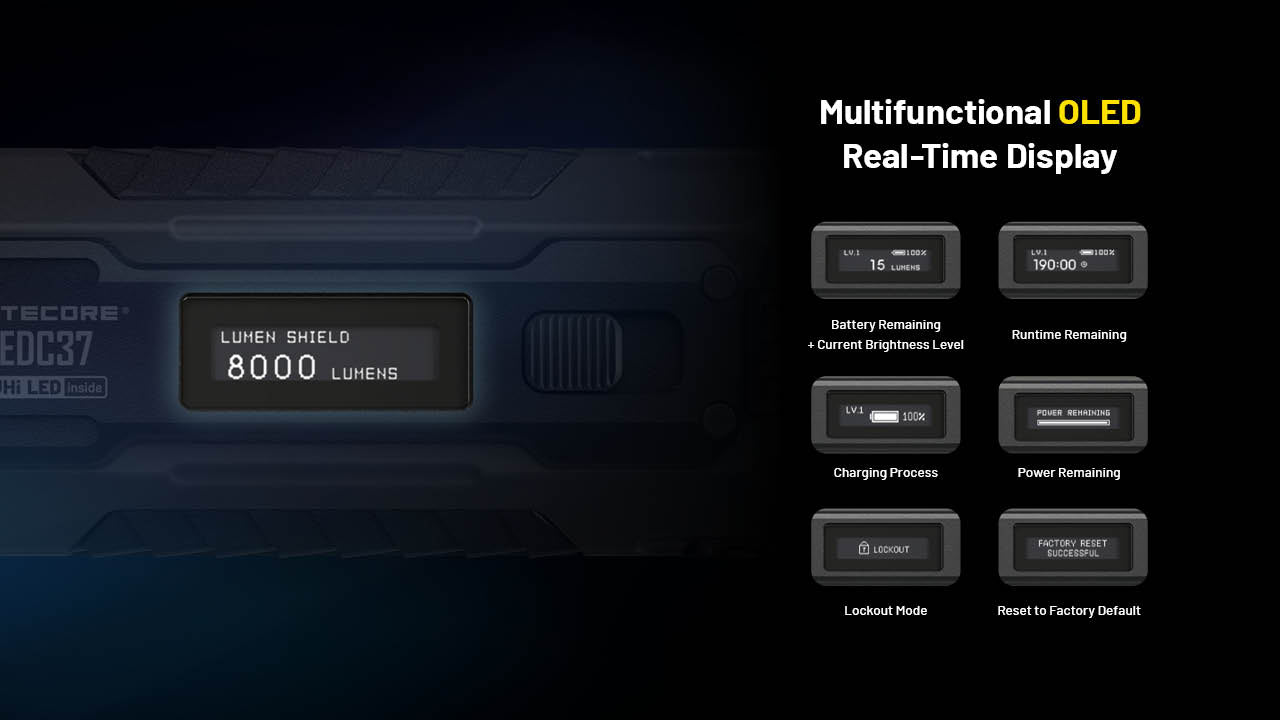 With Spotlight, Floodlight, and Strobe modes, dual-stage tactical buttons, and a digital OLED display, the EDC37 adapts instantly to work, search, emergency, or everyday carry needs.