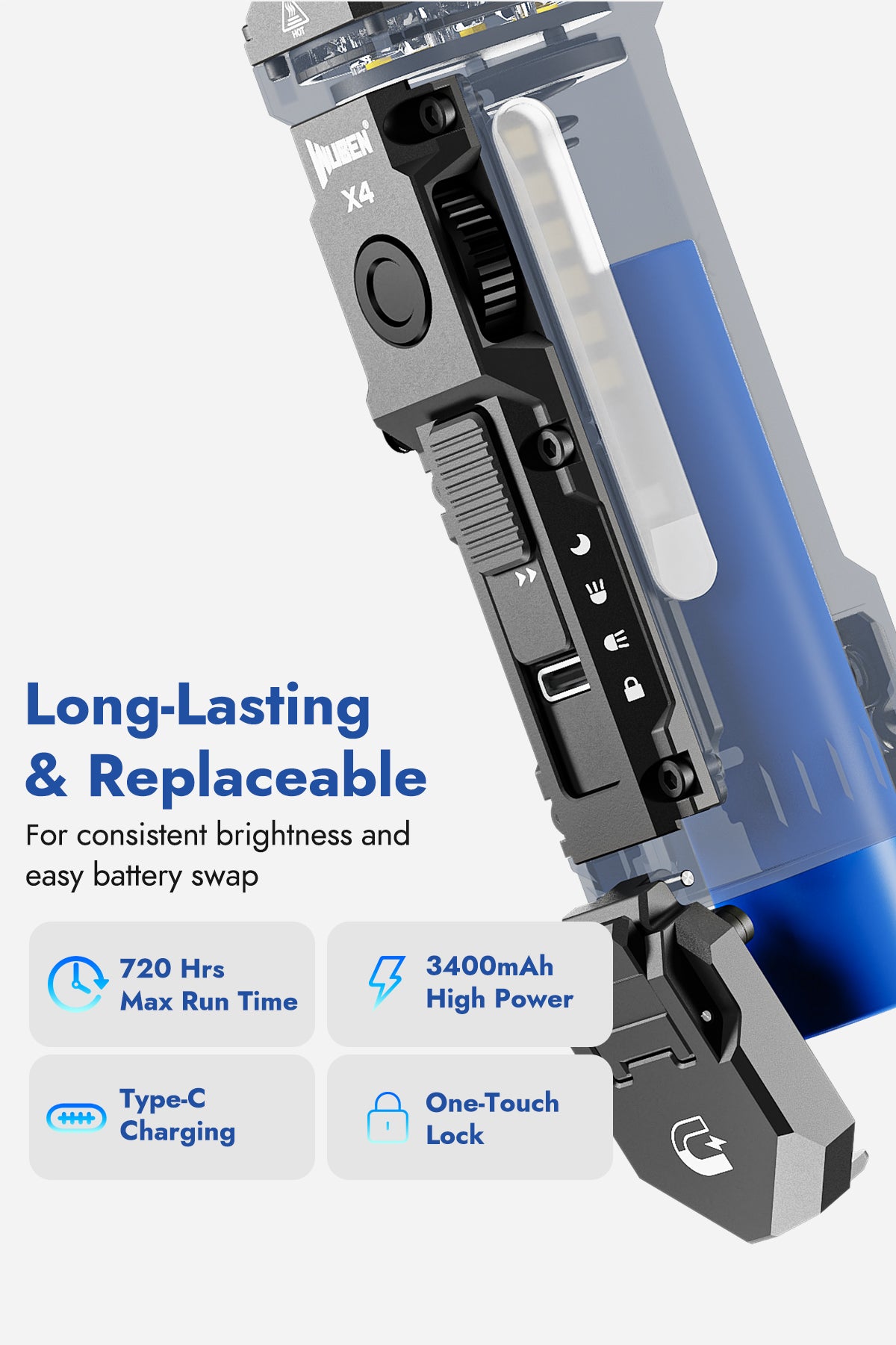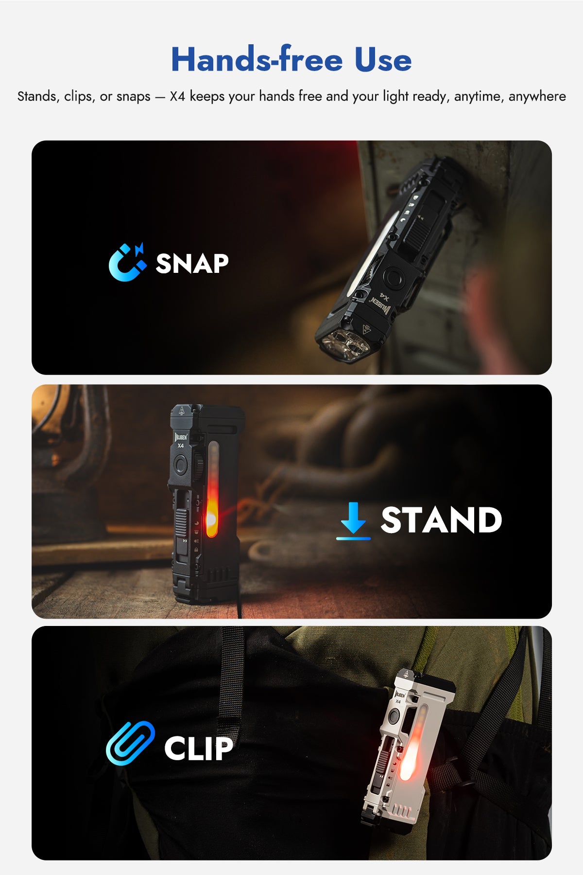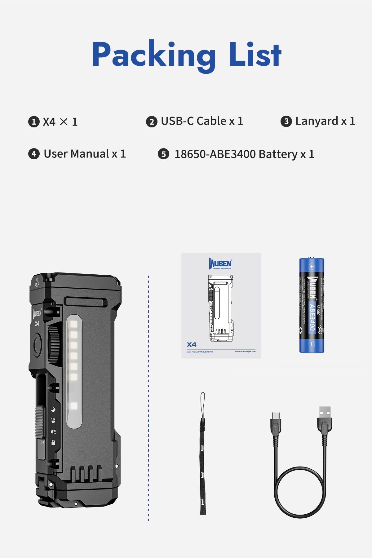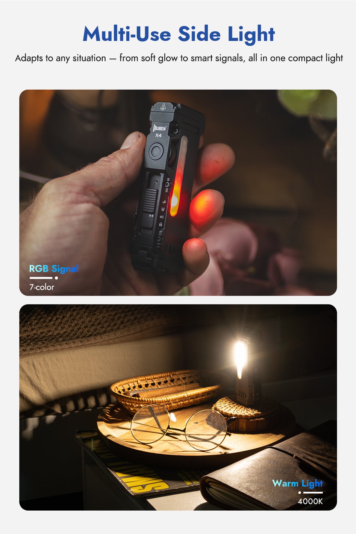Meet the Wuben X4: a compact, flat-body flashlight with a powerful main beam, a warm white side light, and RGB for visibility + fun. Stepless rotary dimming, a slide selector, and a tail paddle give you fast, precise control—at work, on the road, or out camping.