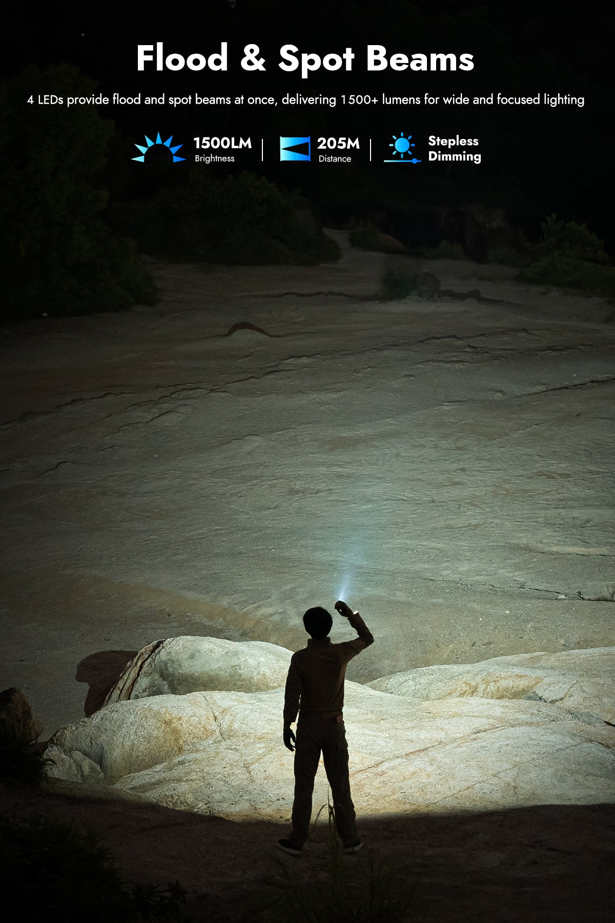 💥 Up to 1500 lumens from the front array with stepless rotary dimming for flood, spot, or both